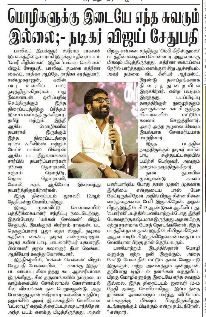 Vijay Sethupathi enraged at Merry Christmas press meet by question about Hindi imposition At the press meet of Merry Christmas in Chennai, Vijay Sethupathi was asked about Tamil Nadu government forcing people not to learn Hindi. Sethupathi lashed out at a reporter saying that wasn't true.