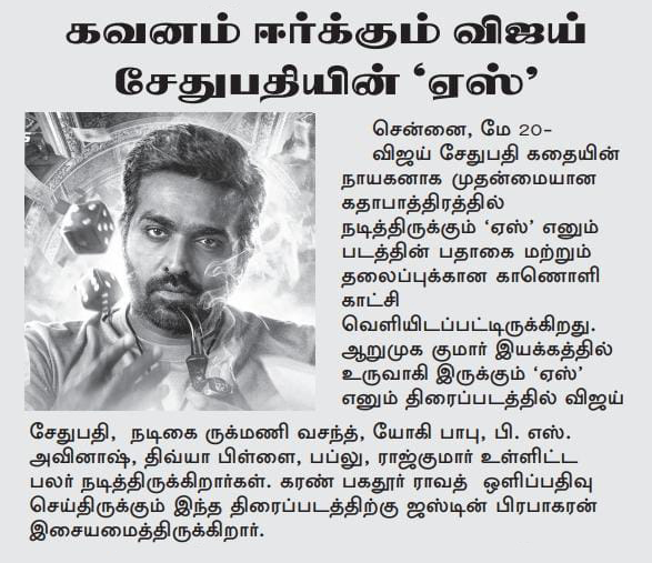 Actor Vijay Sethupathi had been shooting for his yet-to-be titled 51st Film directed by Arumugakumar. While the shooting of the film was wrapped up earlier in December last year, the makers have revealed the first look of the film along with the title of the film, which is `Ace’.